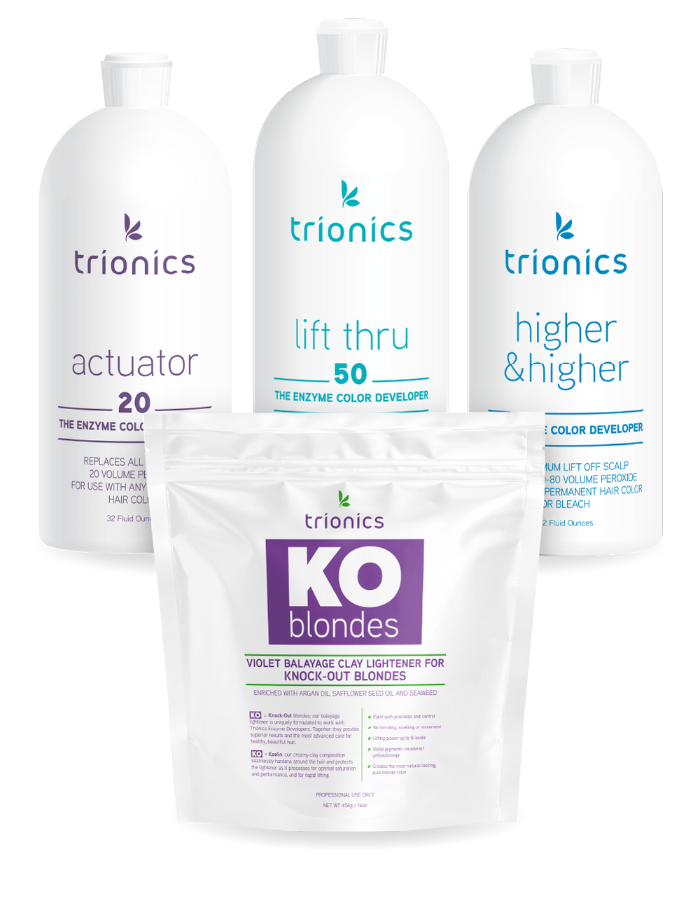 Gently mix 1 part KO blondes balayage lightener with 1 part Trionics Enzyme Developer of your choice—based on your desired level of lift (see below)—to a smooth, creamy consistency. Do not overmix. For thinner mixtures, 1:1.5~2 parts developer.